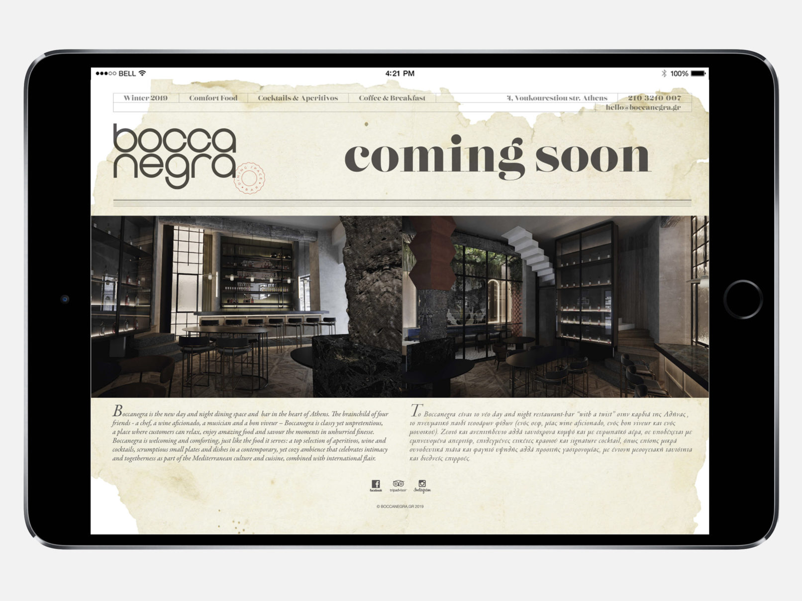 Boccanegra is the new day and night bar and dining space, the brainchild of four friends – a chef, a wine aficionado, a musician and a bon viveur. It is located in the heart of Athens, on the pedestrian street of Voukourestiou – the most glamorous street in the city. We created all branding from scratch; from naming, logo design, menu design, packaging, photography, to web site design and all sales peripherals. Inspired by Mediterranean aesthetics from its interior design, our branding reflects minimal imagery and colour minimalism. Architectural and Interior design by Workroom2 – Soma.