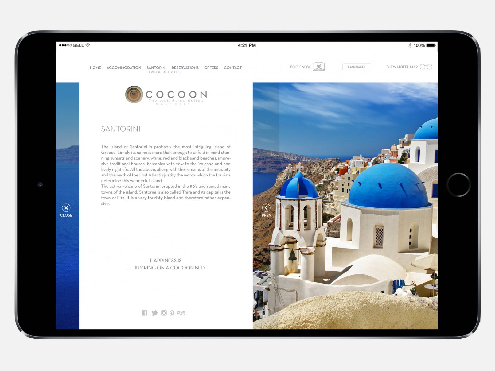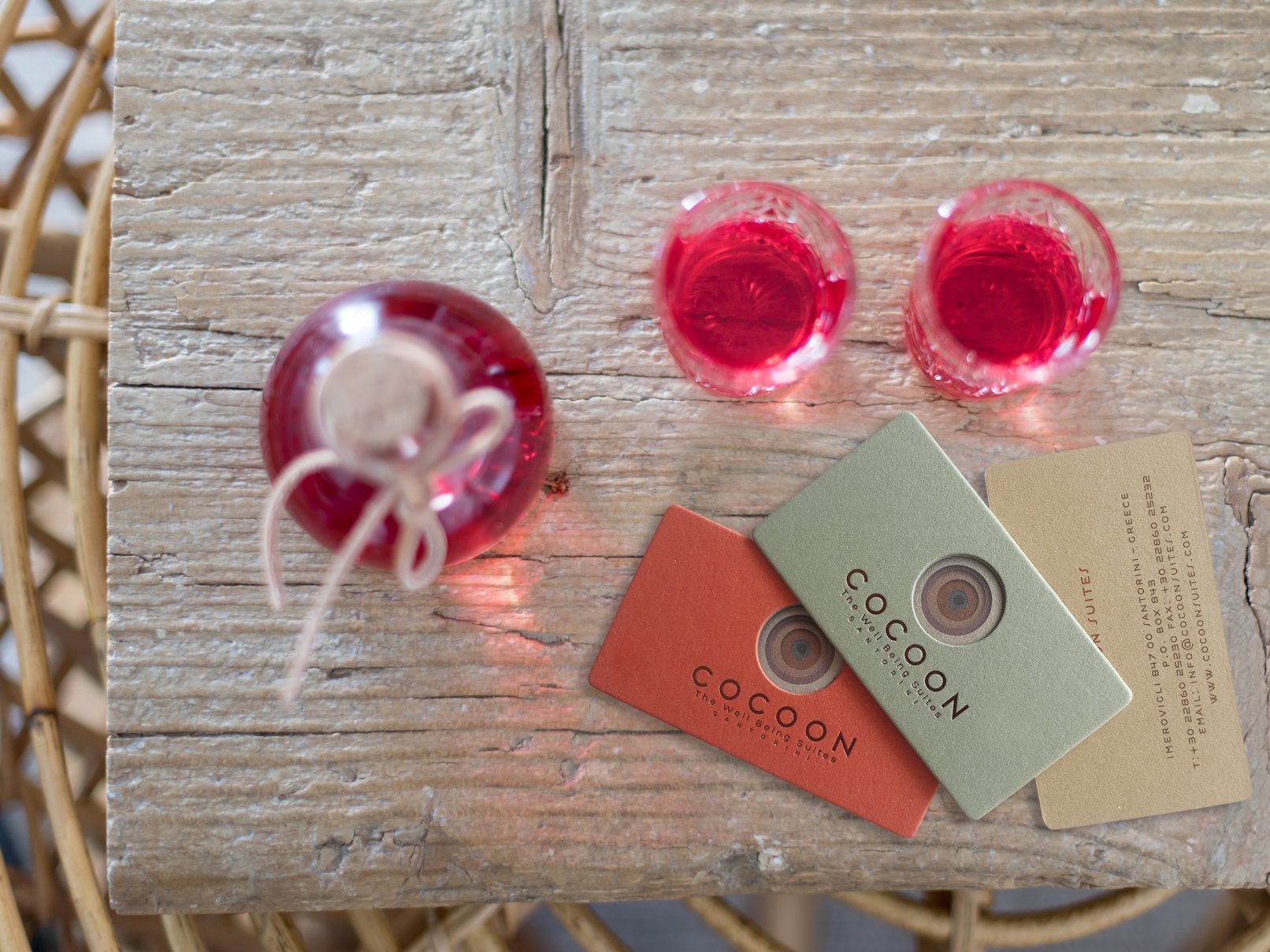 Cocoon Well-Being Suites are located in Merovigli, Santorini, Greece. We created all brand identity from scratch; from the logo and name to all sales peripherals. The unique character of volcanic Santorini called for earthy colours: oranges, greens, whites and ochre. The distinctness of the suites envelop the visitor, as they are dug in caves, like cocoons; which was also the inspiration for the name. Architectural Design by Lab 11.