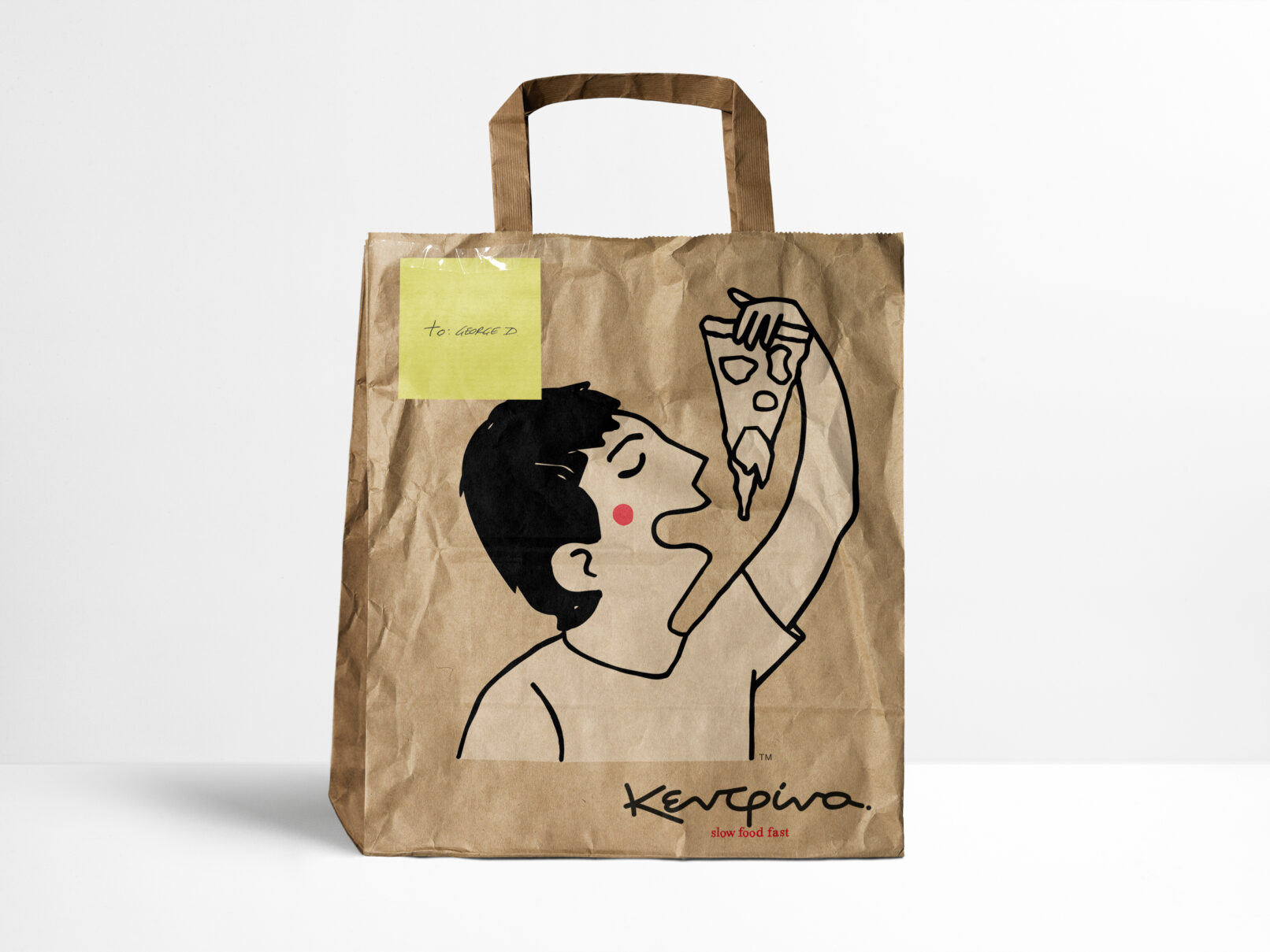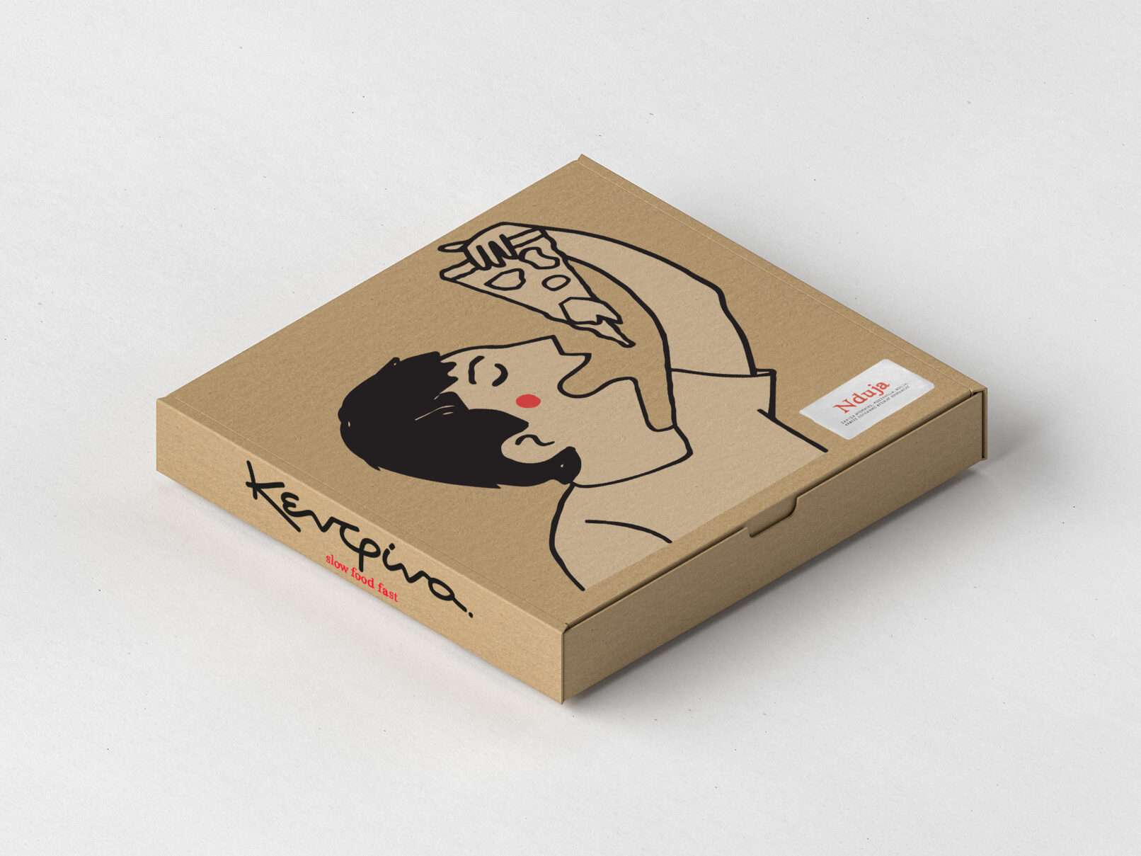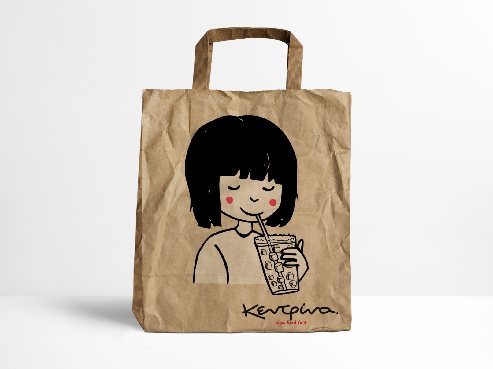 Kentrina are food chain stores, offering pizza, salads, sandwiches, desserts, smoothies, drinks and coffees, located in Athens, Greece. All brand identity was created from scratch; from naming, illustration and packaging, to all sales peripherals. When choosing the colour palette, we wanted to avoid many colours so we used a set of 3 colours warm red, white and black, and emphasized on the two characters.