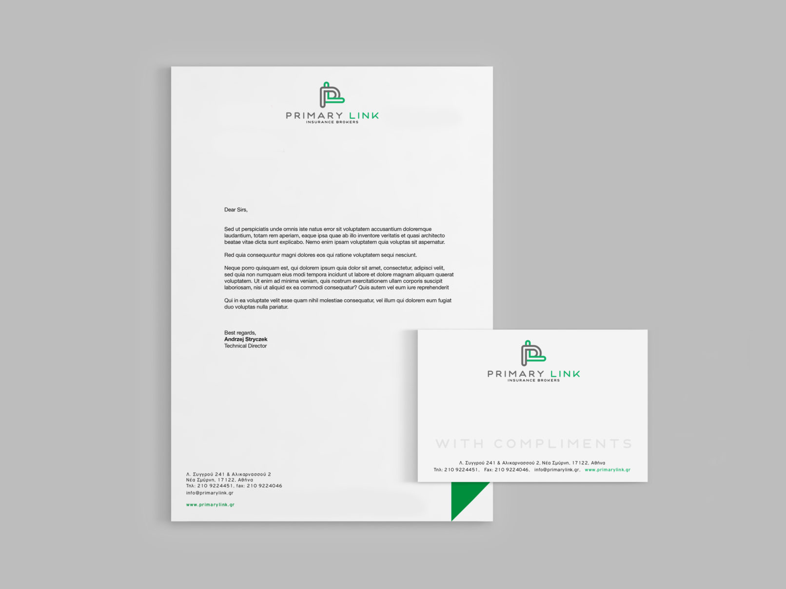 Primary Link is a Greek insurance company. We created the brand identity, the design of the web page and all the sales peripherals. We used green color wich is associated with meanings of growth, harmony, freshness, safety, fertility, and environment.