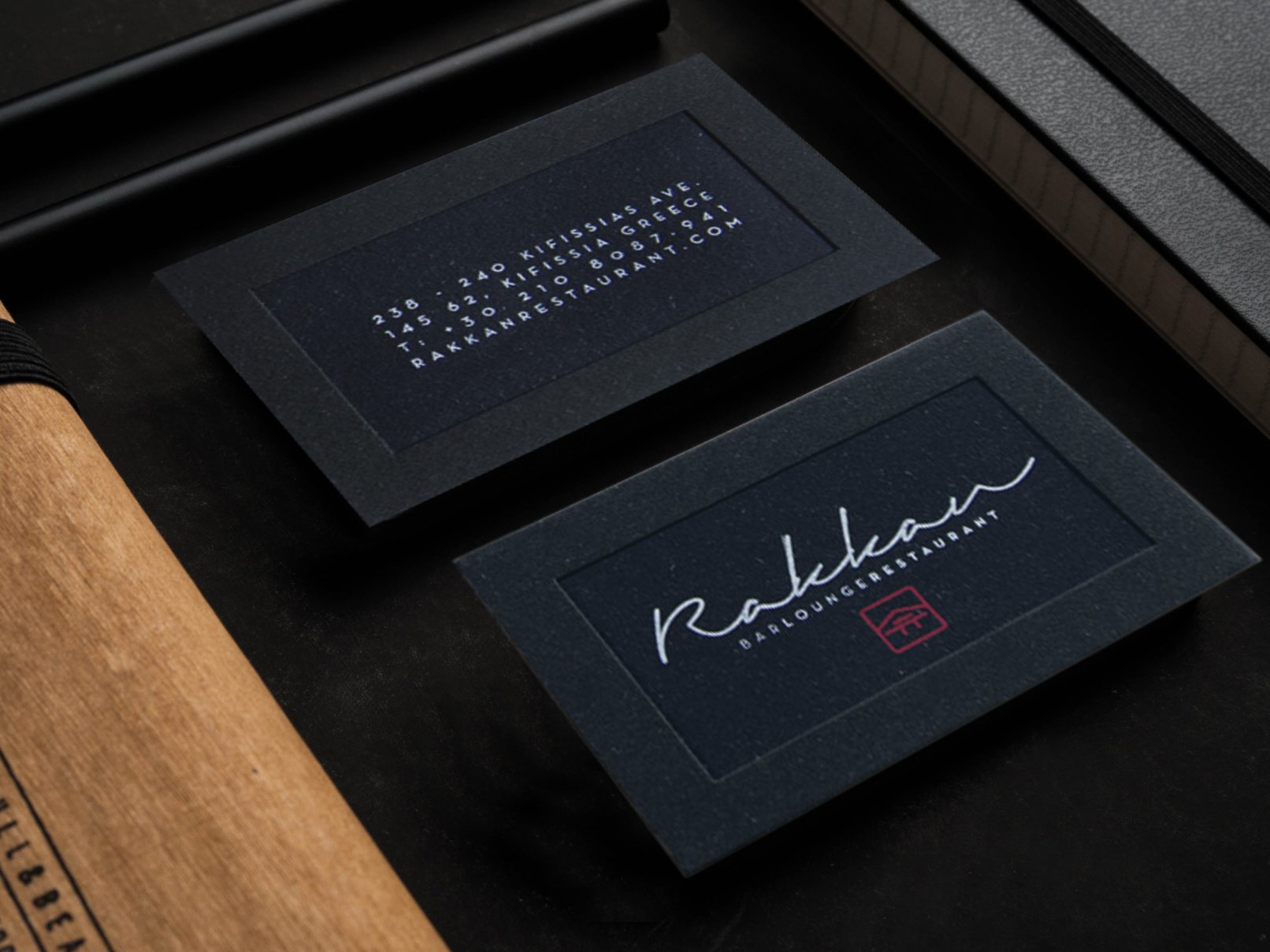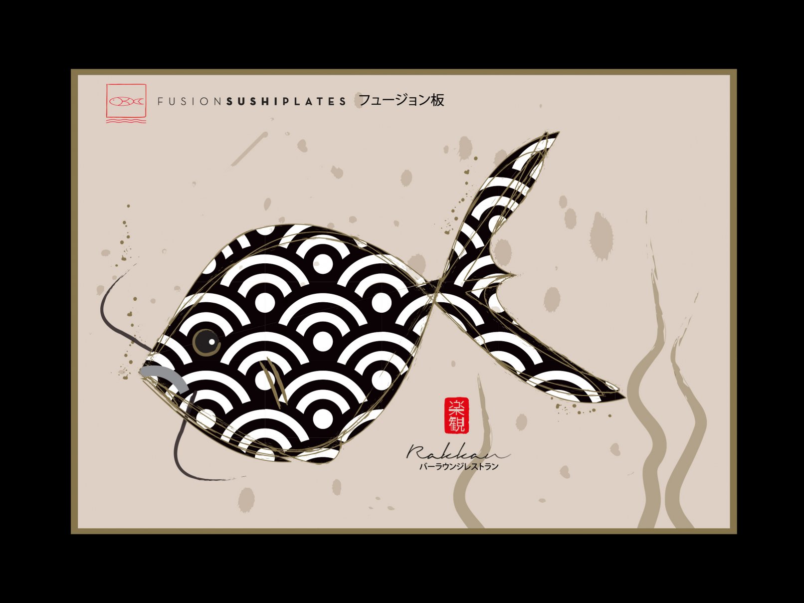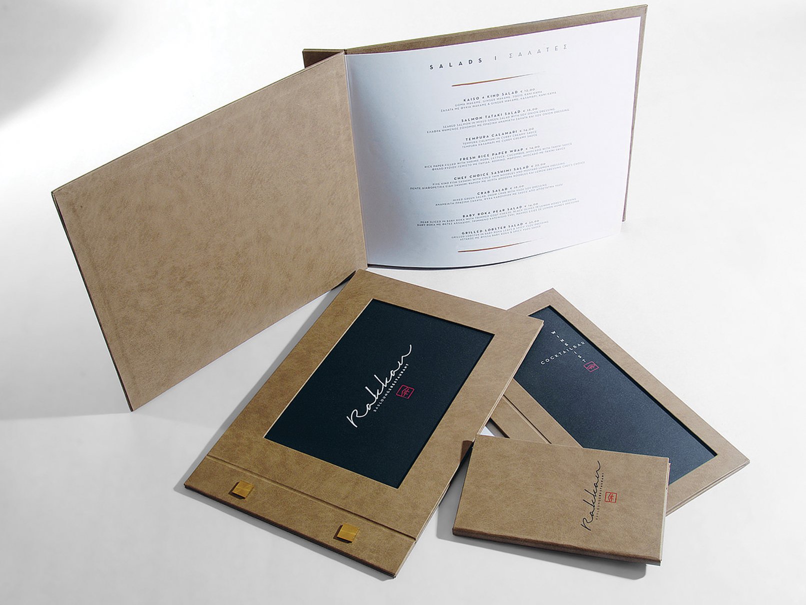 Rakkan, “Optimism” in Japanese, is a sushi fusion bar located in Kifissia, Athens and in Kalo Livadi, Mykonos, Greece. Inspired by Japanese aesthetics and the 9,900 cubes that the restaurant features on its ceiling décor, our branding reflects Japanese minimal imagery and single-colour minimalism. The black brushstrokes and rectangular shapes that invade some of the collateral design are a reminder of the ambience. The monochromatic colour scheme, the Japanese typography selection and the brushstrokes that form the word “Rakkan” give masculine hues to the branding personality to complement the delicacy of the dishes offered.